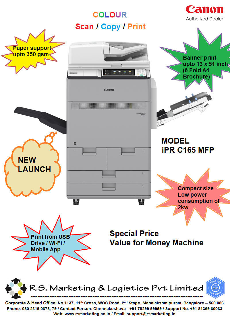 CANON imagePRESS C165 R.S.Marketing and Logistics are the best Dealer in South India for Canon Printers. iPR C165 Specifications 1. Speed: 65 PPM Color/Mono Printer 2. Standard Size (S): 330.20 x 487.68mm (13 X 19.2inch), 350 GSM (Simplex) 3. Banner Paper Size (S): 330.20 x 1300mm (13 X 51.18inch), 300 GSM (Simplex) 4. Auto Duplex (D): 330.20 x 487.68mm (13 X 19.2inch), 220 GSM (Duplex) 5. Scanning : Built-In SP-DADF 6. Scan Resolution: 300 X 300dpi, 600 X 600dpi 7. Memory (RAM) Main CPU : 2 GB 8. Image Processing CPU : 2 GB 9. Memory (HDD) Standard : 250 GB 10. Maximum : 1 TB (Optional)