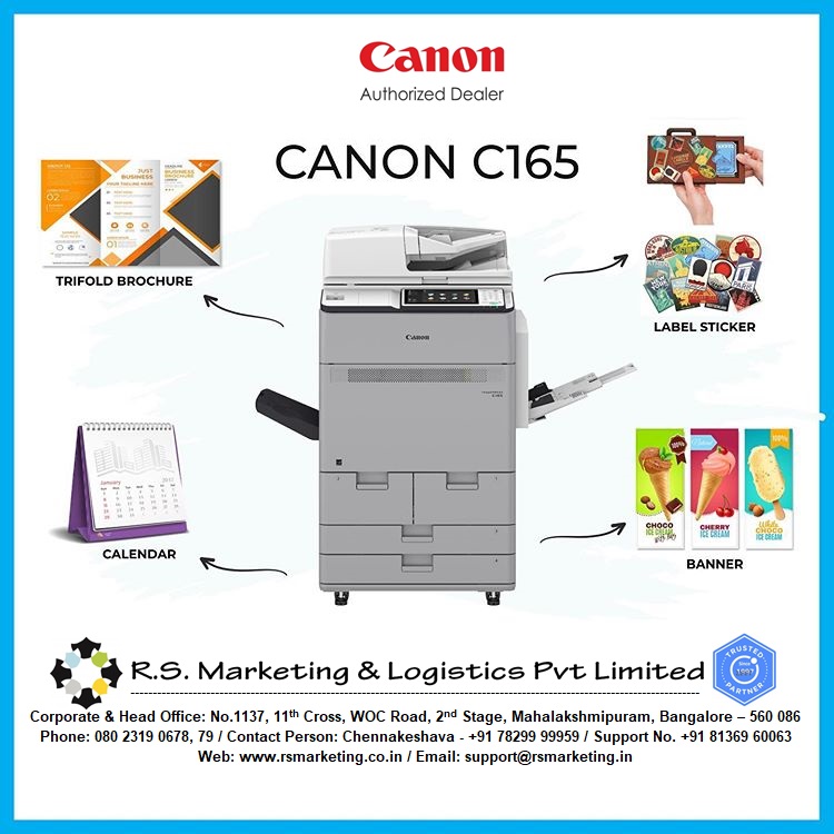 CANON imagePRESS C165 R.S.Marketing and Logistics are the best Dealer in South India for Canon Printers. Features 1. R-VCSEL Laser Technology 2. Multi D.A.T Technology 3. Translucent CV Toner 4. Coated Imaging Transfer Belt 5. Loop Sensor Control 6. Security Features 7. Workflow Efficiency 8. Device and Fleet Management 9. Cost Management