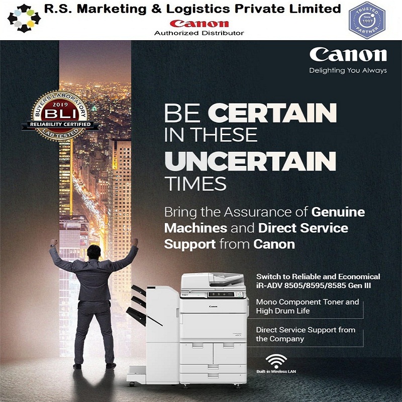 CANON iR-ADV 8505/8595/8585 R.S.Marketing and Logistics are the best Dealer in South India for Canon Printers. Switch to Reliable and Economical iR-ADV 8505/8595/8585 Gen III 1. High Speed Printing of 105/95/85 PPM 2. Built-in Mono Copier and Color Scanner 3. Mono Component Toner and High Drum Life 4. Direct Service Support From the Company