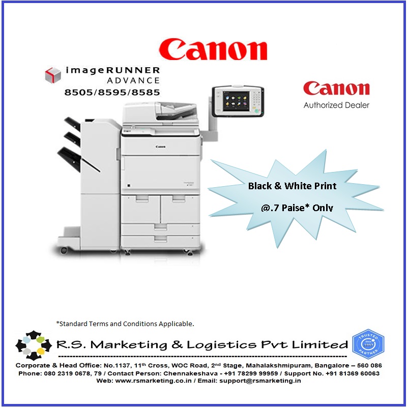 CANON iR-ADV 8505/8595/8585 R.S.Marketing and Logistics are the best Dealer in South India for Canon Printers. Switch to Reliable and Economical iR-ADV 8505/8595/8585 Gen III 1. High Speed Printing of 105/95/85 PPM 2. Built-in Mono Copier and Color Scanner 3. Mono Component Toner and High Drum Life 4. Direct Service Support From the Company
