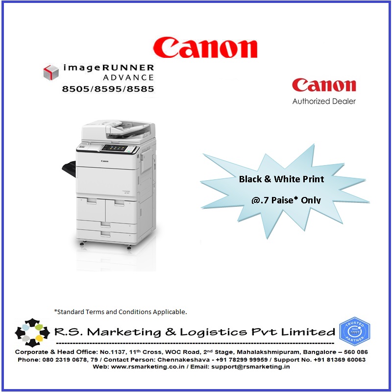 CANON iR-ADV 8505/8595/8585 R.S.Marketing and Logistics are the best Dealer in South India for Canon Printers. Switch to Reliable and Economical iR-ADV 8505/8595/8585 Gen III 1. High Speed Printing of 105/95/85 PPM 2. Built-in Mono Copier and Color Scanner 3. Mono Component Toner and High Drum Life 4. Direct Service Support From the Company