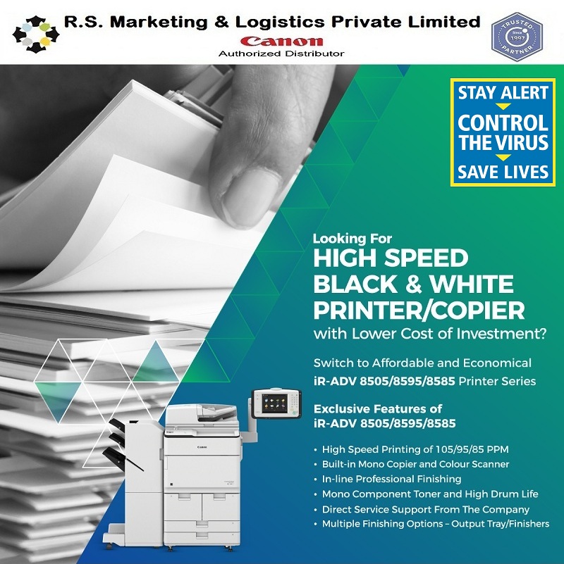 CANON iR-ADV 8505/8595/8585 R.S.Marketing and Logistics are the best Dealer in South India for Canon Printers. Switch to Reliable and Economical iR-ADV 8505/8595/8585 Gen III 1. High Speed Printing of 105/95/85 PPM 2. Built-in Mono Copier and Color Scanner 3. Mono Component Toner and High Drum Life 4. Direct Service Support From the Company.