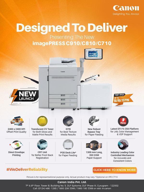 CANON Production Printer R.S.Marketing and Logistics are the best Dealer in South India for Image PRESS C910/C810/C710. 1) Compact Registration Unit 2) R-VCSEL Laser Technology 3) Multi Exposure Technology 4)Translucent CV Toner 5) Advanced Imaging Transfer Belt 6) Multi D.A.T Technology 7) Advanced Twin Belt Fusing Technology 8) Automatic Color Calibration