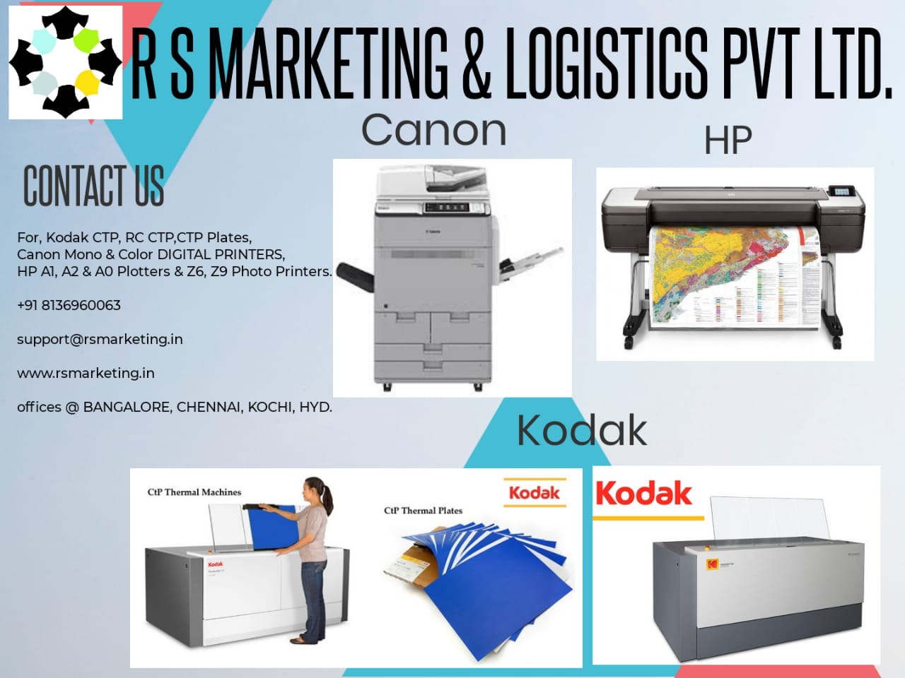 "R.S.Marketing and Logistics are the Authorised Dealer in South India for Canon, HP & Kodak".
